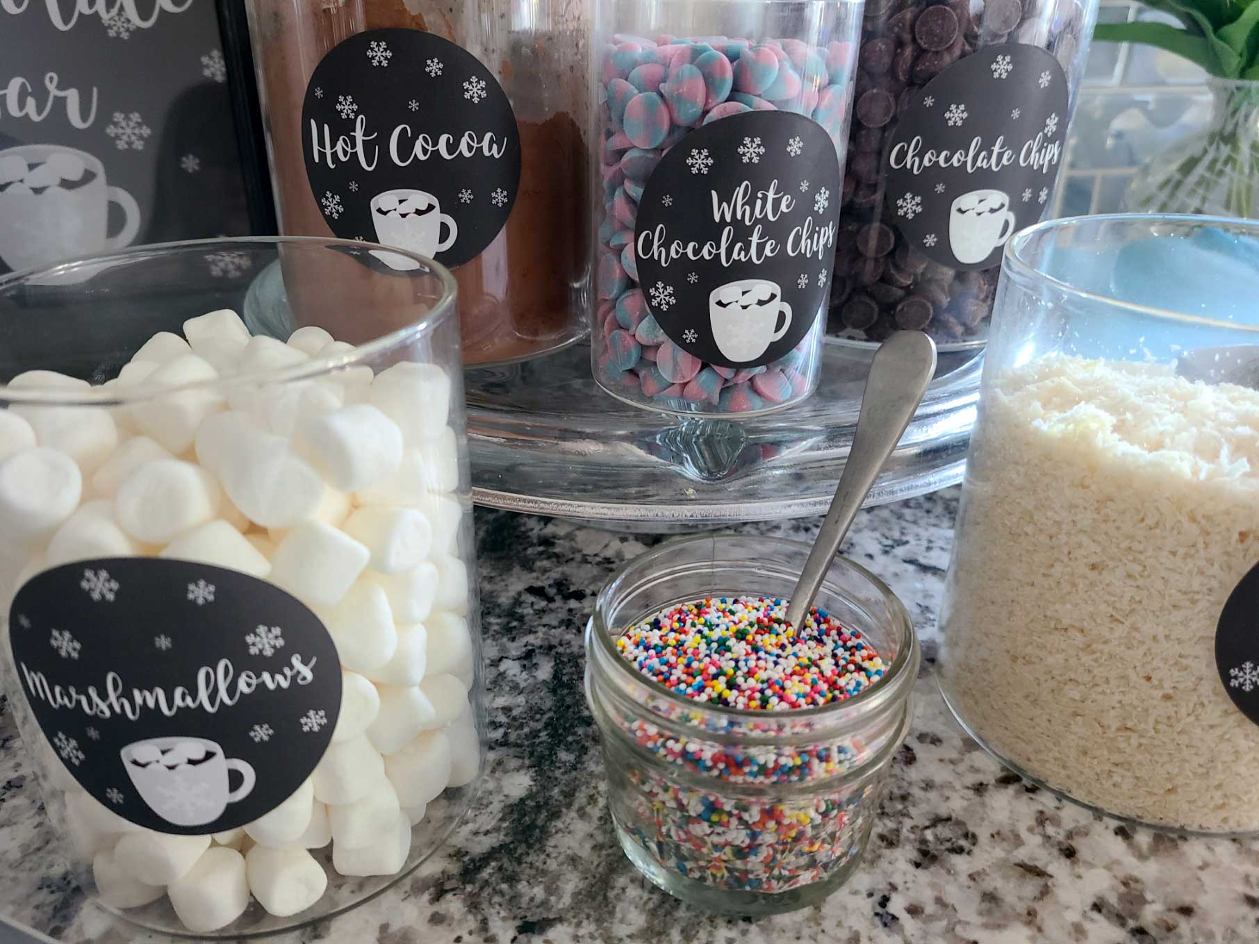 Start by looking around your house for containers or platters. These can be glass jars, mason jars, fancy cups, or serving plates. The glass jars are ones I was already using for pantry storage. You can vary the containers with what you have. But by keeping them matching it makes it look cohesive and organized. Simply turn them around (so any current labels don't show) and place removable labels on the front to make matching hot cocoa decor. Or instead of labels print out free printable paper tags (page 1, page 2), punch a small hole through the top, and tie it on your jar with decorative twine. Why use labels when people can already tell what the hot cocoa toppings are? Because they are an easy and cheap way add to the decor and help tie everything together.